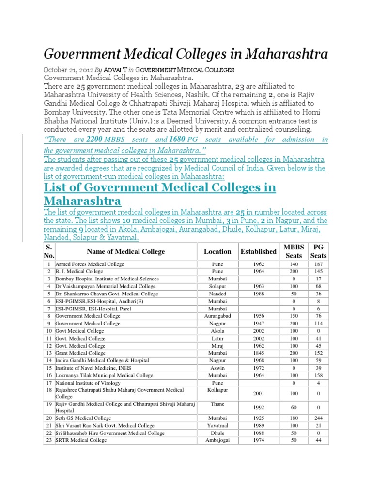 Government Medical Colleges In Maharashtra Mumbai Medicine - Prominent cities like mumbai and pune have a number of medical colleges but other small towns and cities also have medical/mbbs colleges.